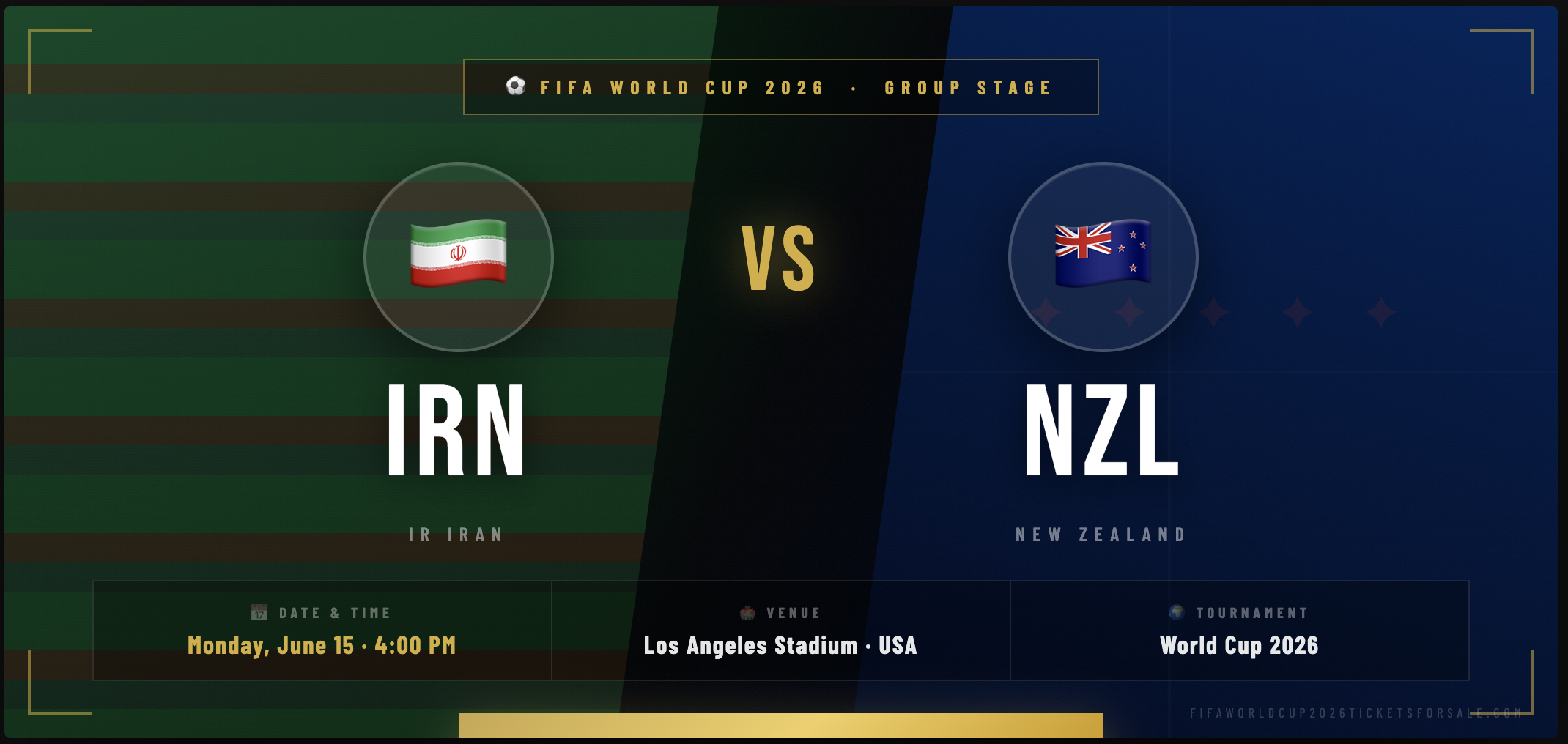 Watch IR Iran vs New Zealand live at the FIFA World Cup 2026 on Monday, 15 June at 4:00 PM at Los Angeles Stadium, USA โšฝ. Enjoy premium FIFA World Cup tickets with VIP hospitality, sideline seating, gourmet dining, and exclusive beverages. All tickets are secured through our trusted and verified broker network, guaranteeing authenticity. ๐ŸŽŸ๏ธ